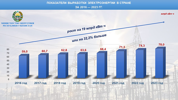 In 2023, Uzbekistan generated 77.9 billion kWh of electricity, a 4.8% increase from the previous year. This included 69.6 billion kWh generated by TPPs. While the country exported 1.9 billion kWh of electricity in 2023, it also imported 4.9 billion kWh to meet domestic demand. A total of 71.2 billion kWh of electricity was transported through the main electric network.