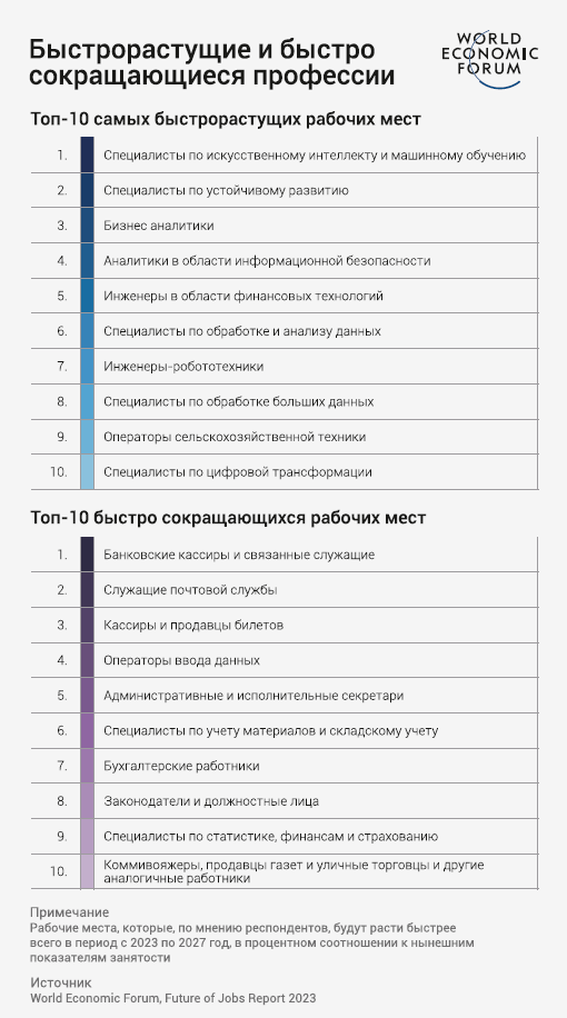 Согласно прогнозам, ИИ может как создать миллионы новых рабочих мест, так и оставить многих без работы. В докладе Всемирного экономического форума «Будущее рабочих мест за 2023 год» говорится, что профессии в области ИИ, машинного обучения, цифровой трансформации и аналитики данных являются одними из самых востребованных. Однако ИИ не способен заменить все профессии, особенно те, что требуют здравого смысла, креативности, физической ловкости и эмоционального интеллекта.