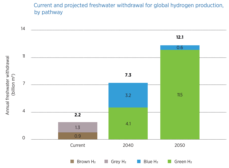 According to IRENA, approximately 2.2 billion m3 of freshwater are used annually for global hydrogen production, accounting for 0.6% of the total volume of freshwater withdrawn by the energy sector.