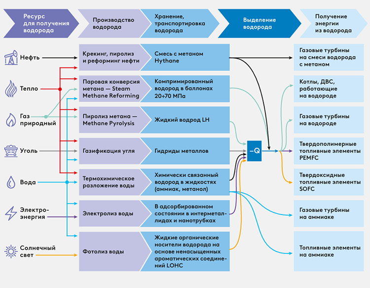 Сегодня в мире в структуре производства водорода доминирует органическое топливо (природный газ, уголь и нефть) — 96%, и только 4% водорода производится методом электроли¬за воды. Основные технологические цепочки водородной энергетики от получения до применения водорода в качестве энергоносителя приведены на рис. 1.