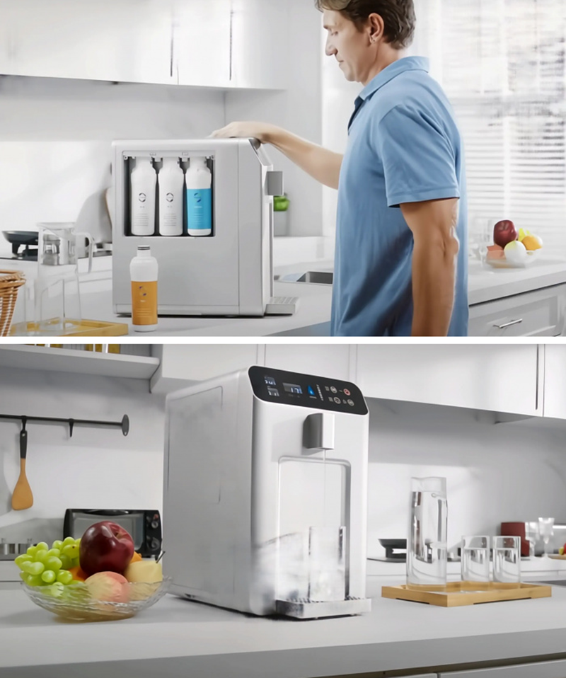 Домашний аппарат, позволяющий получать чистую воду прямо из воздуха, разработан компанией DrinkingMaker (США). Устройство, похожее на кофемашину, собирает влагу из воздуха и очищает ее с помощью шестиступенчатой фильтрации и ультрафиолетового излучения, уничтожающего микробы. На выходе получается вода, очищенная до 99,9 %. Встроенный HEPA-фильтр также очищает воздух, используемый в процессе. Таким образом, аппарат одновременно выполняет три задачи: осушает воздух, очищает его и генерирует питьевую воду. Устройство способно производить до 19 литров питьевой воды в сутки, а питание для работы может получать от солнечных батарей.