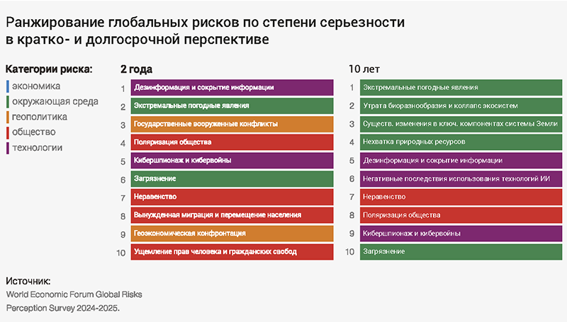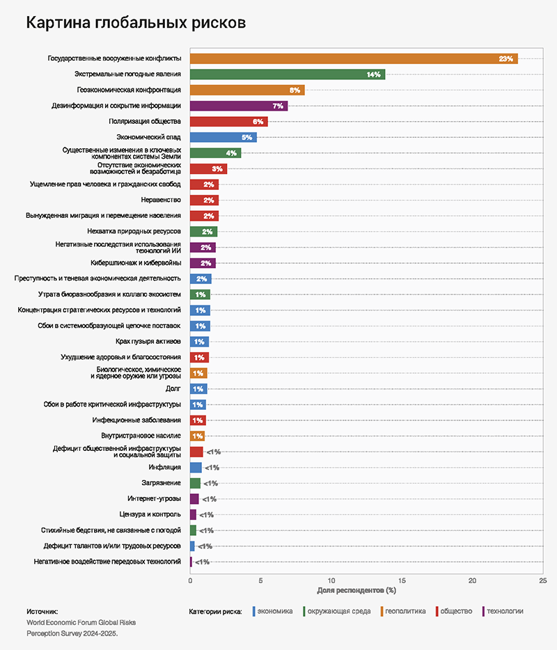 Углубляющиеся геополитические и геоэкономические напряжения. Вооружённые конфликты между государствами заняли 1-е место среди краткосрочных рисков. Это отражает растущее беспокойство по поводу конфликтов (Украина, Ближний Восток, Судан). Возросло восприятие геоэкономической конфронтации (подъём с 14-го на 9-е место). Кибершпионаж и кибервойны — также в числе ведущих рисков.