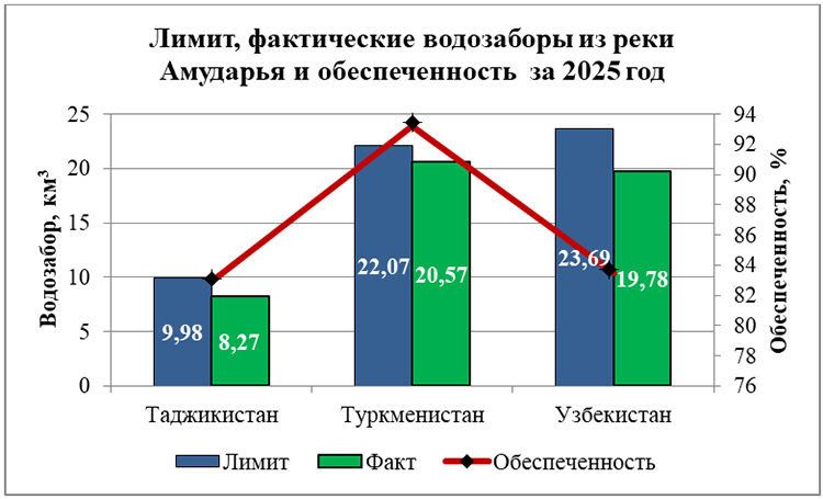 В 2025 г. из малого бассейна р.Амударья при лимите водозабора 55,74 км3 фактически было забрано 48,62 км3 воды, в т.ч. 34,20 км3 в вегетационный период. Годовой лимит использован на 87%, в период вегетации – на 86%. По государствам фактический водозабор был распределен следующим образом:
