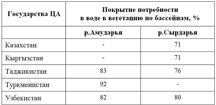 Покрытие потребности в воде в вегетацию по государствам ЦА отражено в таблице ниже.