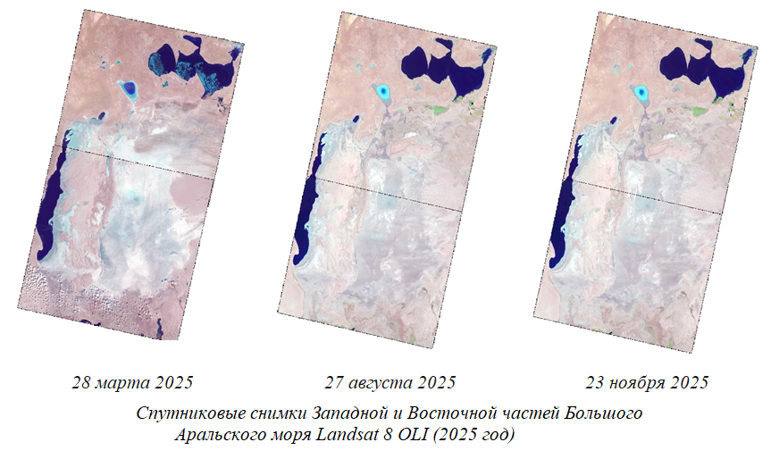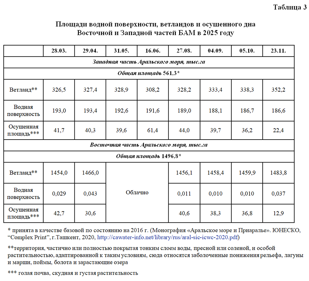 Спутниковый мониторинг зафиксировал уменьшение площади водной поверхности Западной части БАМ и незначительные изменения в Восточной. Одновременно наблюдалось сокращение водной поверхности озерных систем Южного Приаралья, особенно в летний период, что обусловлено снижением водоподачи и высокой испаряемостью. Общий объем поступления воды в эти водоемы также уменьшился по сравнению с предыдущим годом.