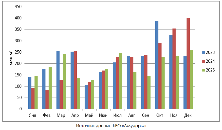 По данным БВО «Амударья», в 2025 г. в дельту р.Амударья поступило 2291 млн м3 воды (включая речной сток, сбросы из каналов и коллекторов), что на 297 млн м3 меньше, чем в 2024 г., и на 419 млн м3 меньше, чем в 2023 г.