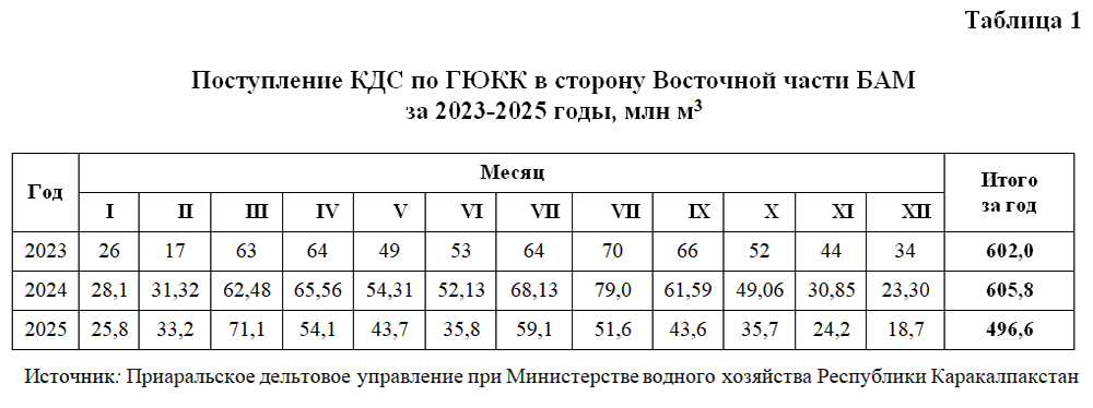 В 2025 г. вода в сторону БАМ поступала только по ГЮКК (496,6 млн м3). Из дельты р.Амударья и Северного Аральского моря (САМ) вода в БАМ не поступала (табл. 2).