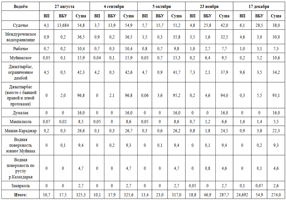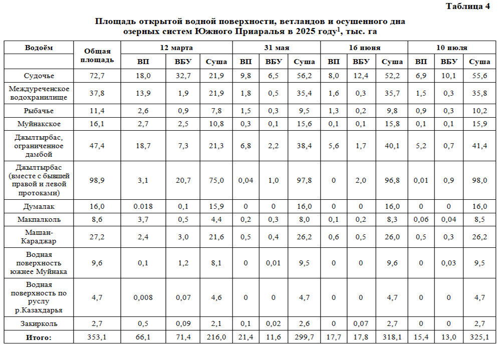 В течение года отмечается общая тенденция сокращения площади водной поверхности. За период с марта по декабрь она уменьшилась более чем в 2,5 раза - с 66,1 до 24,6 тыс.га. Наиболее интенсивное сокращение наблюдалось в весенне-летний период: к сентябрю площадь снизилась до 10,1 тыс.га. В последующие месяцы зафиксировано частичное восстановление – с октября по декабрь площадь увеличилась с 13,4 до 24,6 тыс.га. Данная динамика обусловлена ограниченными объемами поступления воды в дельту р.Амударья, что привело к значительному снижению площади водной поверхности летом и ее частичному восстановлению в осенне-зимний период (табл. 4).