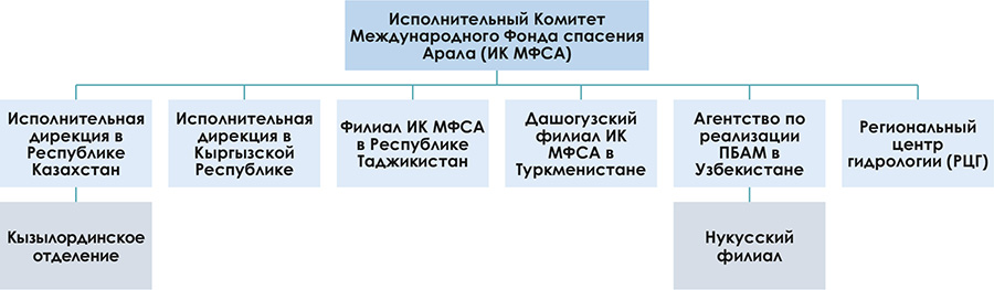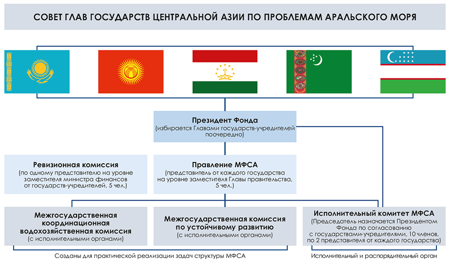 Международный Фонд спасения Арала (МФСА) создан решением глав государств ЦА 4 января 1993 г. с целью разработки и финансирования экологических и научно-практических проектов и программ, направленных на экологическое оздоровление районов, подвергшихся влиянию Аральской катастрофы, и решение социально-экономических проблем региона. Организационная структура МФСА представлена на схеме ниже.