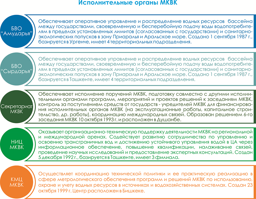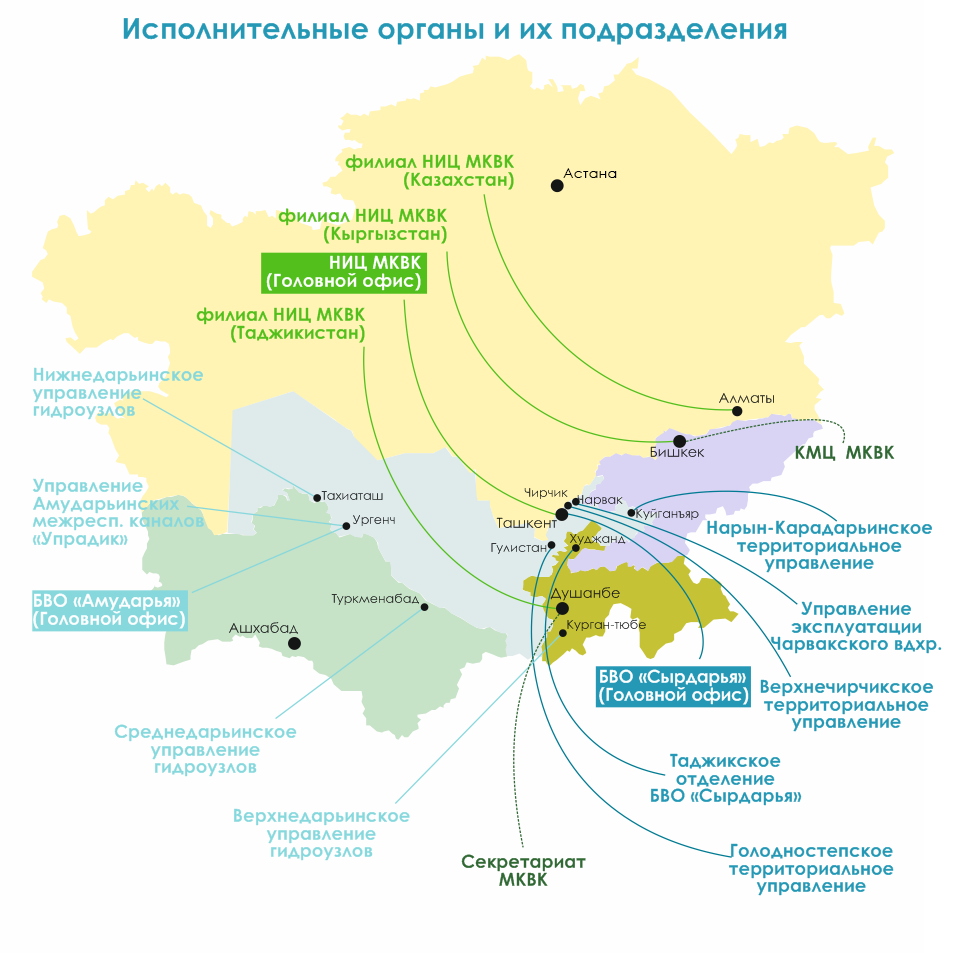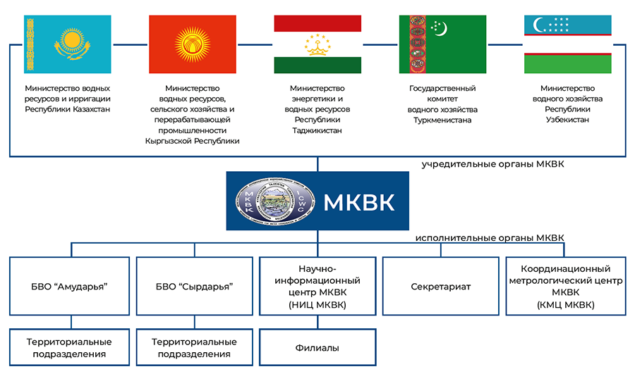 Межгосударственная координационная водохозяйственная комиссия Центральной Азии – региональный орган государств ЦА по совместному решению вопросов управления, рационального использования и охраны водных ресурсов межгосударственных источников в бассейне Аральского моря и реализации совместно намеченных программ на основе принципов коллегиальности и взаимного уважения интересов сторон. Создана 18 февраля 1992 г. Организационная структура МКВК представлена на схеме ниже.