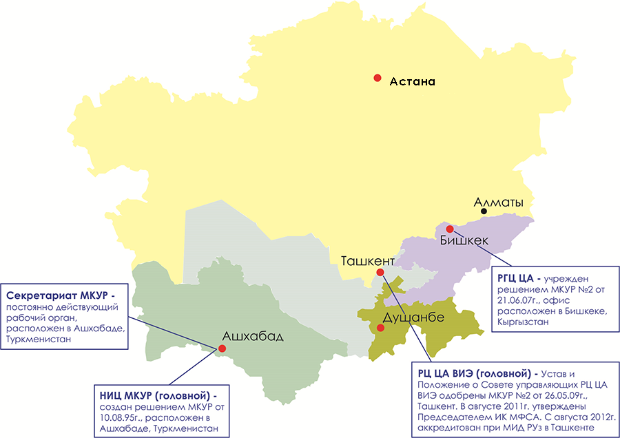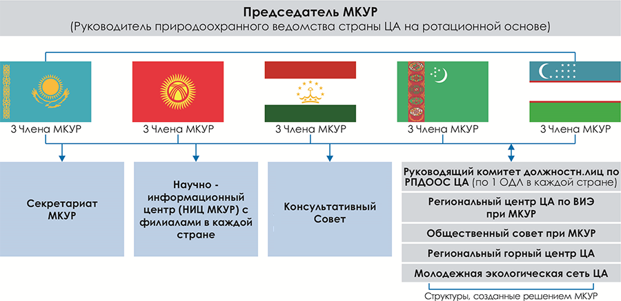 Межгосударственная комиссия по устойчивому развитию (МКУР) создана решением Межгосударственного Совета по проблемам бассейна Аральского моря в 1993 г. с целью координации и управления региональным сотрудничеством в области окружающей среды и устойчивого развития стран ЦА. Организационная структура МКУР и местоположение исполнительных органов представлены на схемах ниже.